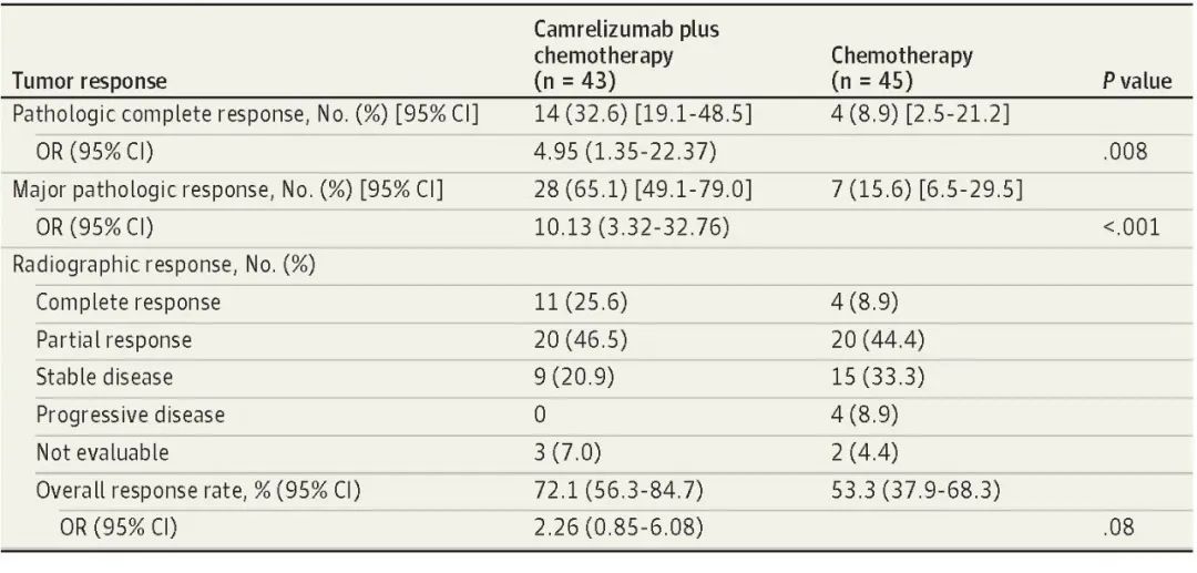 北京时间8月3日,永利皇宫官网医药创新药卡瑞利珠单抗联合化疗(Cam+CT)对比化疗(CT)新辅助治疗ⅢA/ⅢB (T3N2) 期非小细胞肺癌(NSCLC)结果在线发表于国际权威期刊JAMA Oncology[1]。该研究是由空军军医大学唐都医院姜涛教授、雷杰教授团队联合陕西省肿瘤医院雷光焰教授团队、兰州大学第二附属医院王成教授团队共同参与的一项随机对照、多中心、Ⅱ期临床研究(TD-FOREKNOW,NCT04338620)。研究结果显示,与化疗相比,卡瑞利珠单抗联合化疗新辅助治疗NSCLC显著提高了病理完全缓解(pCR)率(32.6% vs 8.9%,OR=4.95,95% CI :1.35-22.37, P =0 .008),且安全性良好。本研究是卡瑞利珠单抗新辅助治疗可切除NSCLC患者的首个随机对照研究,为NSCLC新辅助免疫治疗再添新证。