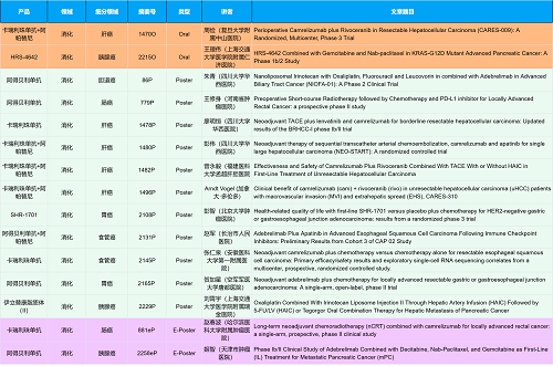 在消化系统肿瘤领域,永利皇宫官网创新产品相关研究共入选2项口头报告、10项壁报和2项电子壁报,共14项研究。除了明星药物卡瑞利珠单抗和阿帕替尼外,还有5篇阿得贝利单抗治疗消化系统肿瘤的研究入选。此外,HRS-4642、瑞拉芙普-α注射液(SHR-1701)等未上市创新产品也有相应研究入选。随着新老药物前沿研究的不断推进,有望为消化系统肿瘤患者带来新的福音!